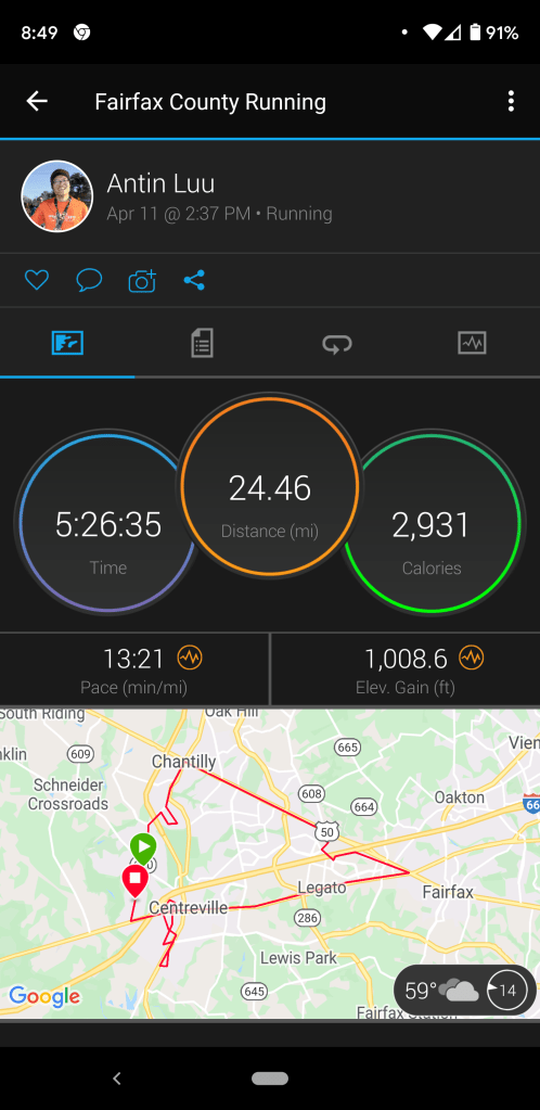 Lee Highway was shorter than I expected. I reached back in Centreville around at mile 18. I was disappointed that I still had a bunch of miles left. At this point I hit my first wall (extreme tireness). This is the worst part because when you hit the wall, only thing you want to do is to stop running. And usually my goal is to push to the end. Today, there was no specific end point for me to focus on. Instead, I had to plan on where and how I get in another 6-8 miles. I am familiar with Centreville. From one end to the other is only 2-3 miles. So there were not a lot of running room so to speak. It is like the airplane being out of fuel and you can’t land yet but keep circling around. That what I had to do.