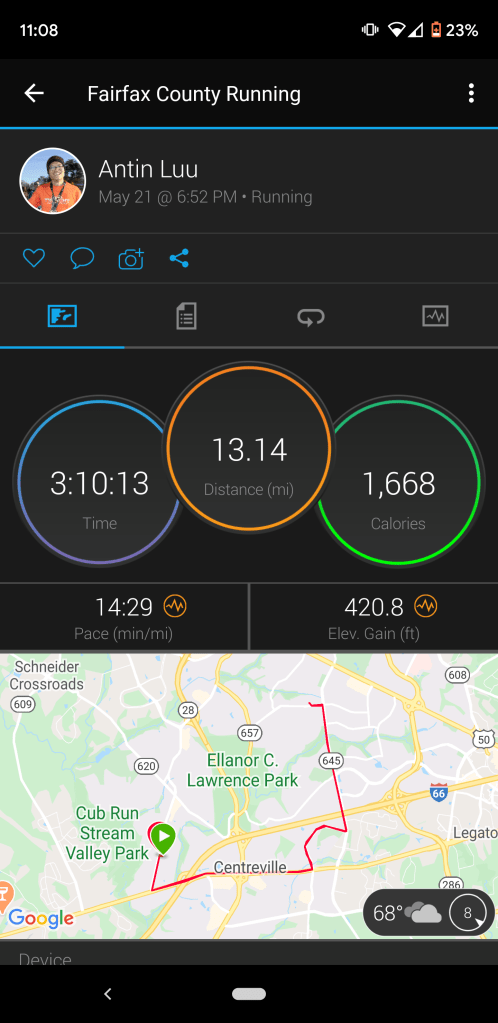 Tonight run was short. I have double up the mileage after couple days of rest. It felt good to able easily handle a half marathon each night. A year ago, it was unimaginable that I could do that.