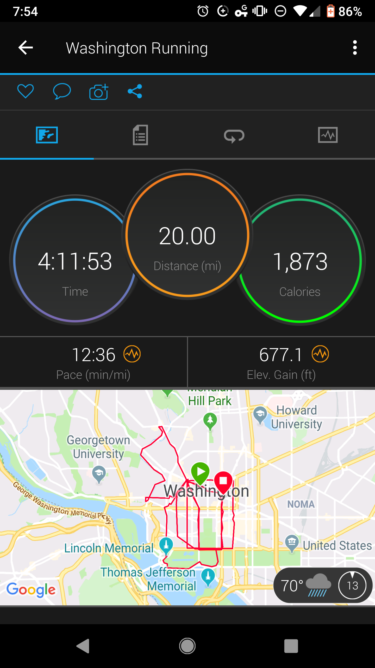 Well I decided to try any way. My motivation was to finish early enough so I can catch the train home. I use our club run routes because they are familiar to me (I dont have to think on where to turn) and their distance are known to me. The fun thing for me was to remember all the routes we did, and to not get bored. Each route is about 3.5 to 4 miles. If I do it five times I should get 20 miles. Normally it takes about 45 mins to an hour to run a route. Note, since it is in the city, we stop for traffic lights and the stopping time is included. There are a lot of lights.