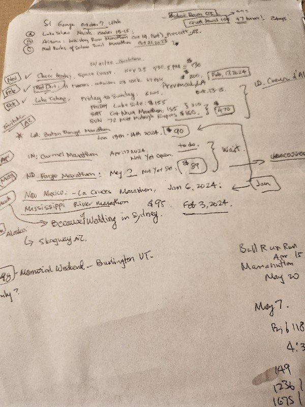 My chimken stratches of my planning process for first half of 2024 races — basic trying to limit myself to 1 race a month. Nothing decided yet. Some races are open for registration! I have been playing with the sheet every day for the past week. It has been my plate mat.