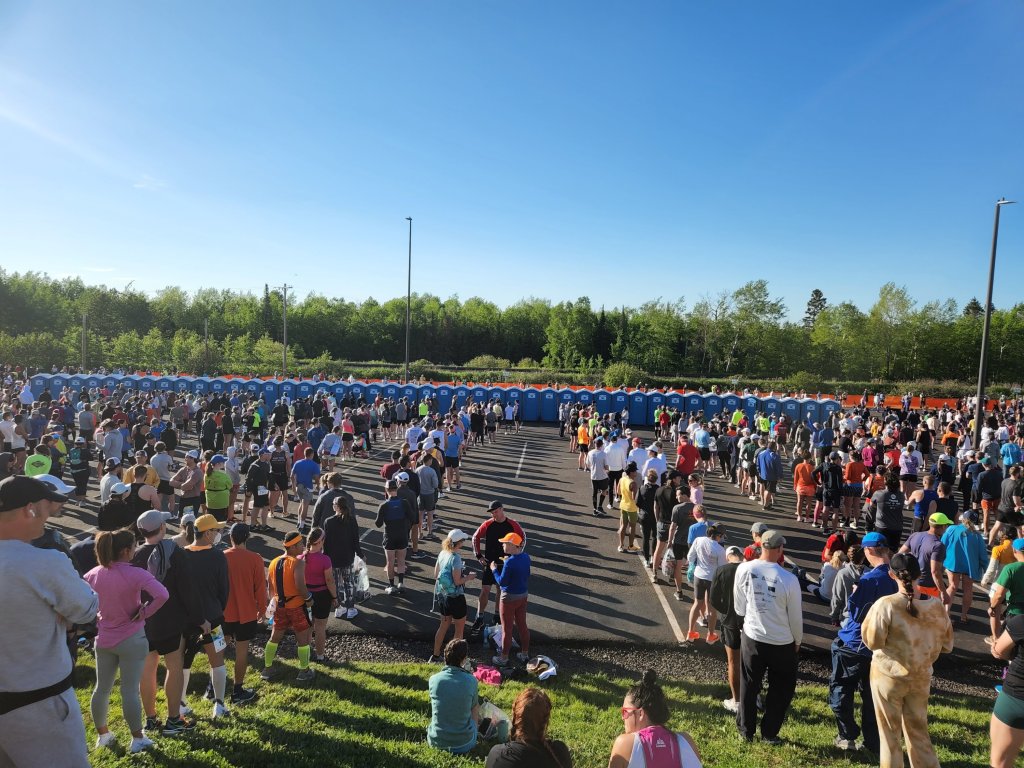 The cold weather ended up being not an issue. We had a great and warm day. Overcast in the morning and became sunny later on. The temperature was little cold for some, but for me it was perfect. It stayed almost constant around 60F, about 15 C. I ran in tee and shorts, though I wore a double layer tee I got from the Duluth marathon and a thick shorts, I think of wool like material. The shorts were a bit too warm later on.